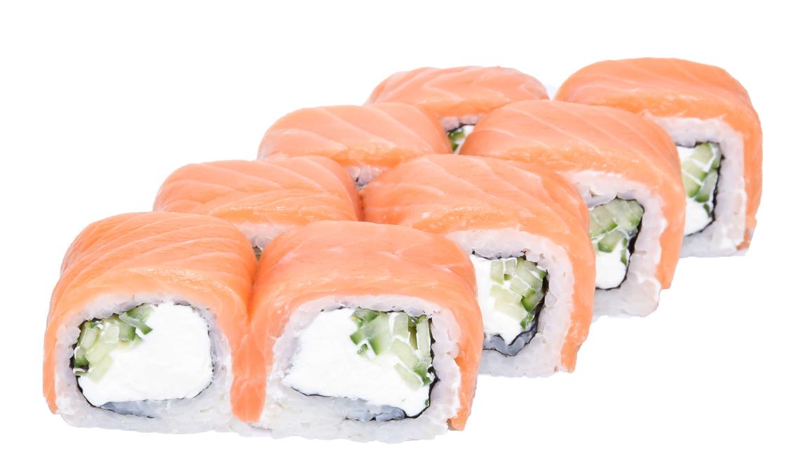 Состав: рис, нори, сливоч. сыр, лосось, огурец