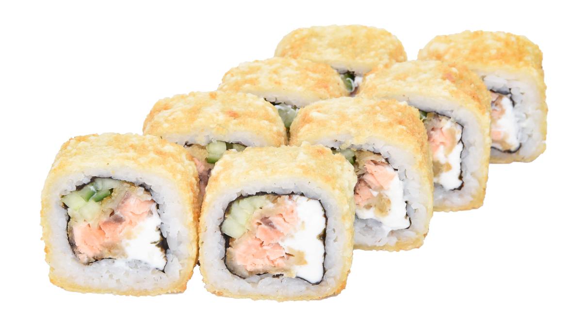 Состав: рис, нори, сливоч. сыр, лосось в кляре и сухарях, огурец, кляр.