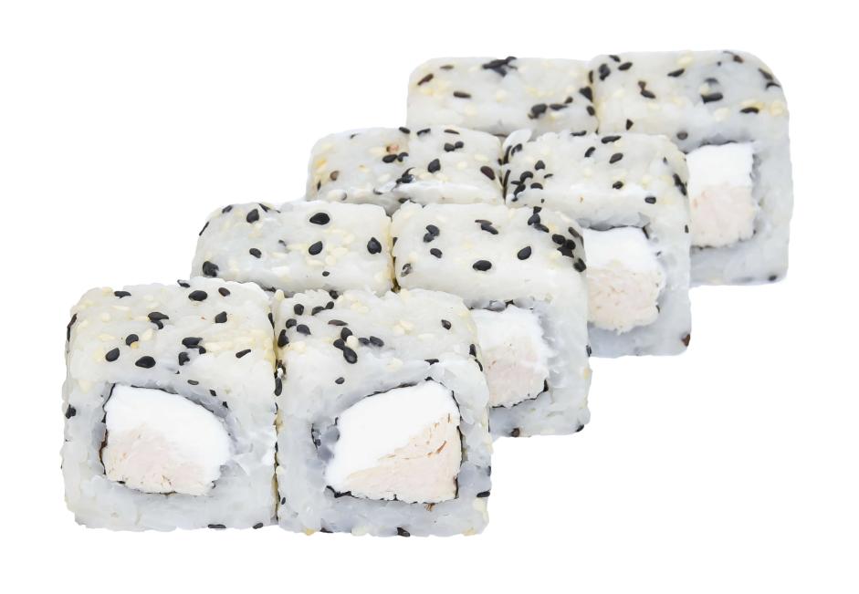 Состав: рис, нори, копч. курица (халяль), сливоч. сыр, кунжут черный, кунжут белый.