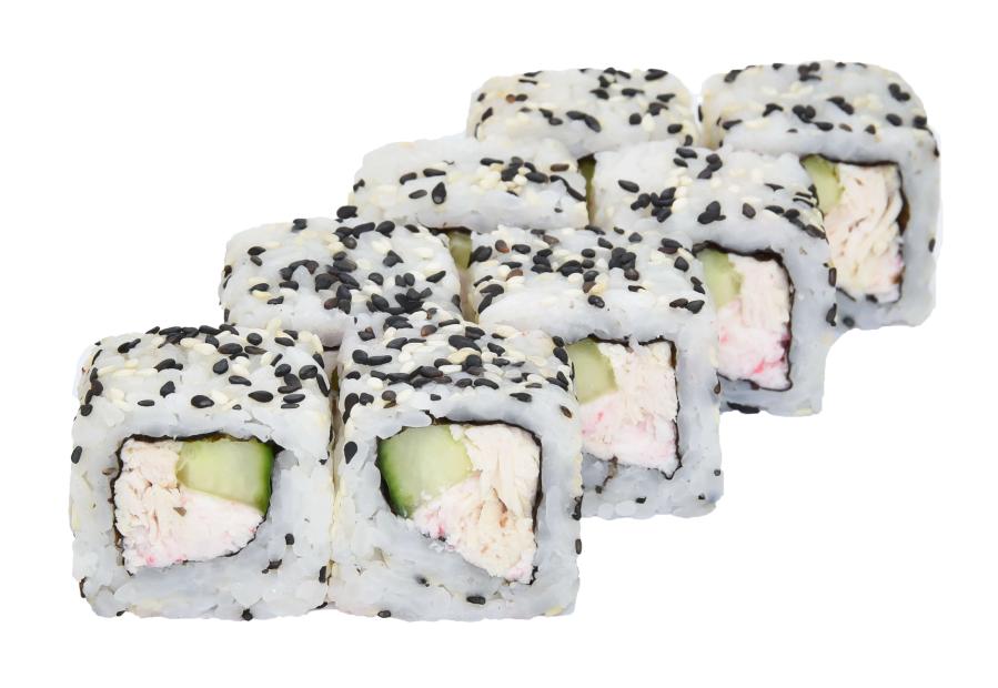 Состав: рис, нори, огурец, кремкраб, копч. курица (халяль), кунжут черный, кунжут белый.