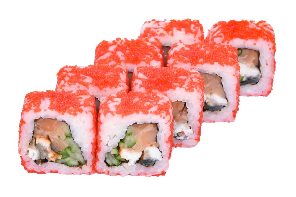 Состав: рис, нори, огурец, угорь, лосось, икра масаго.