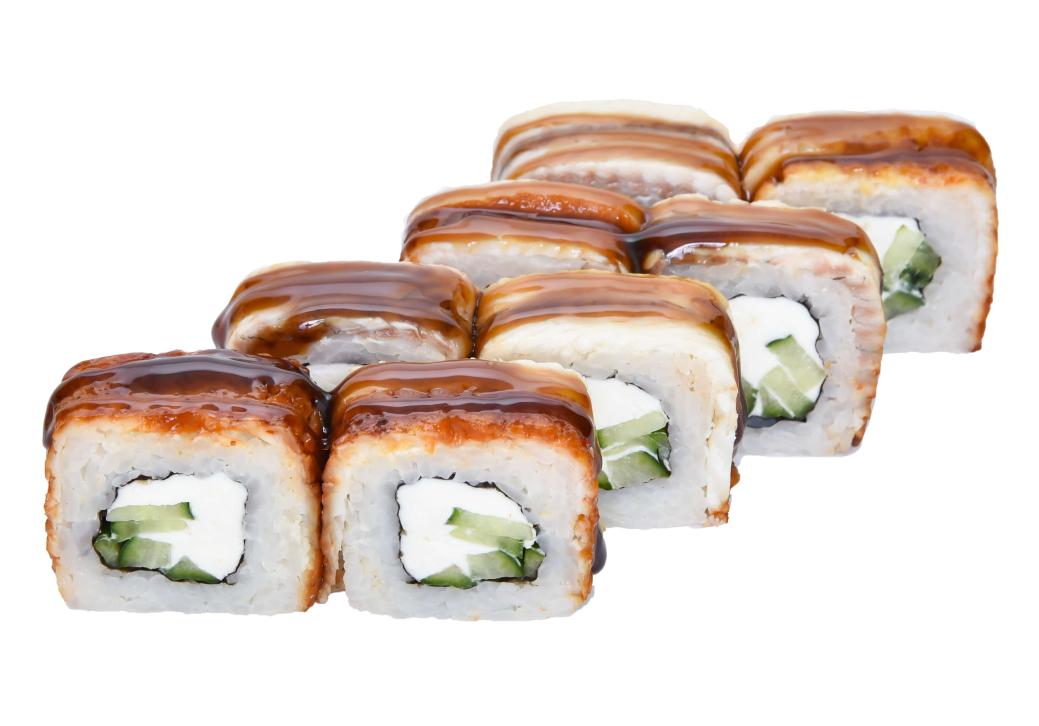 Состав: рис, нори, сливоч. сыр, огурец, угорь, унаги соус. ВНИМАНИЕ! Допускается попадание мелких костей!