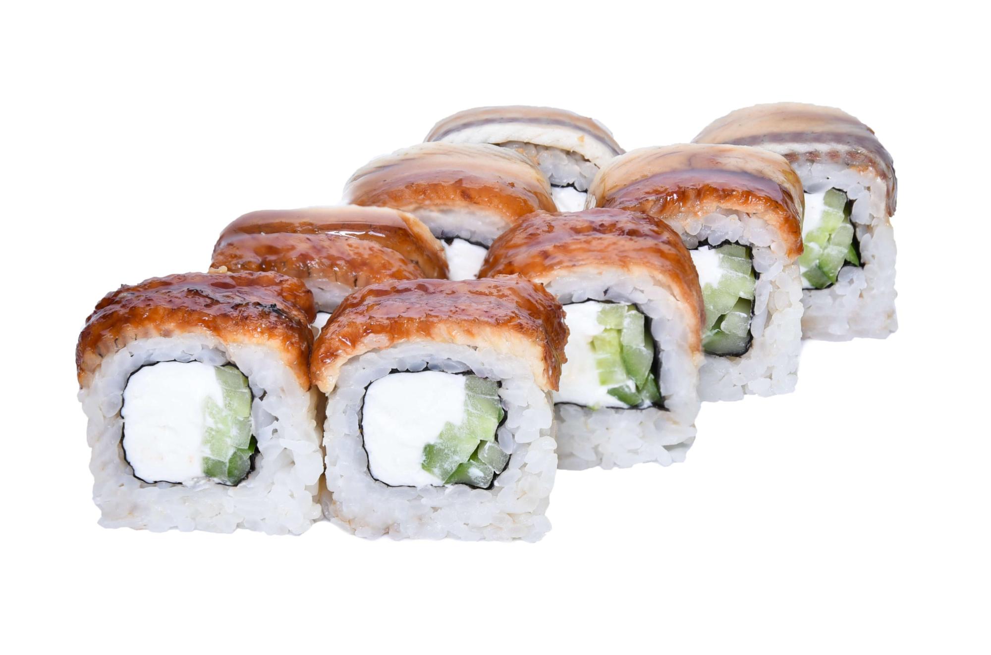 Состав: рис, нори, угорь, слив. сыр, огурец, соус унаги.