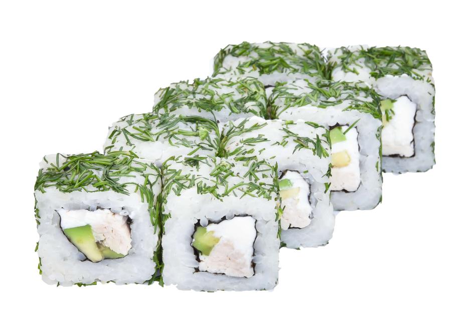 Состав: рис, нори, сливоч. сыр, авокадо, копч. курица(халяль), укроп.