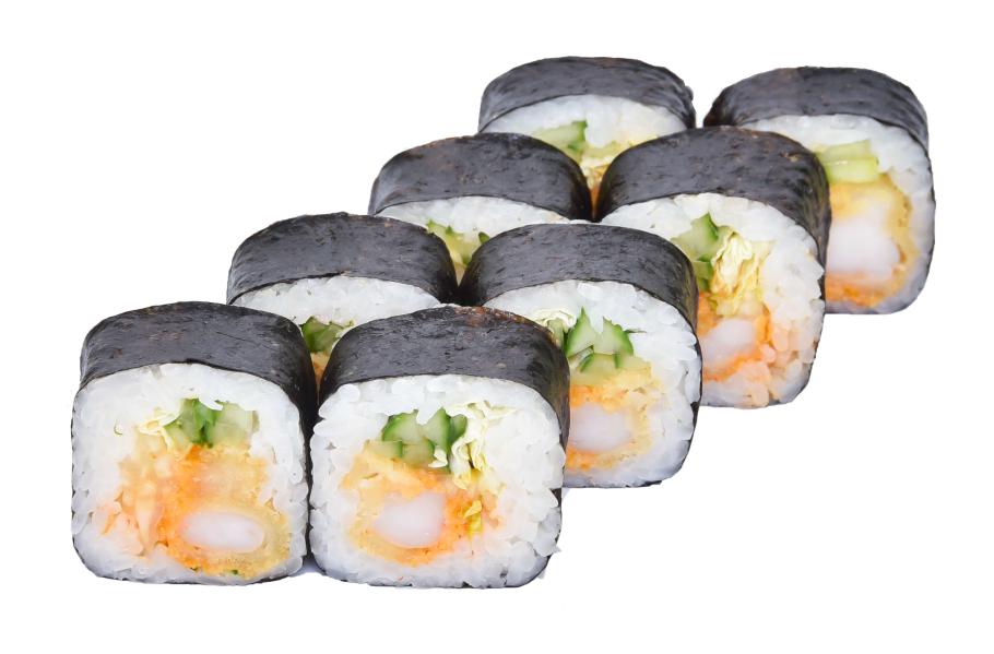 Состав: рис, нори, креветка в кляре, соус острый шрирача (острый), огурец, капуста пекинская