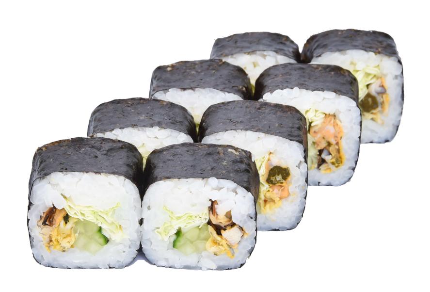 Состав: рис, нори, мидии, соус шрирача (острый), огурец, капуста пекинская