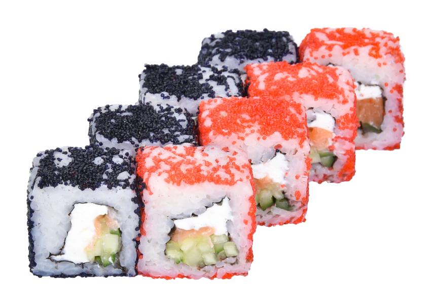 Состав: рис, нори, лосось, сливоч. сыр, огурец, икра масаго