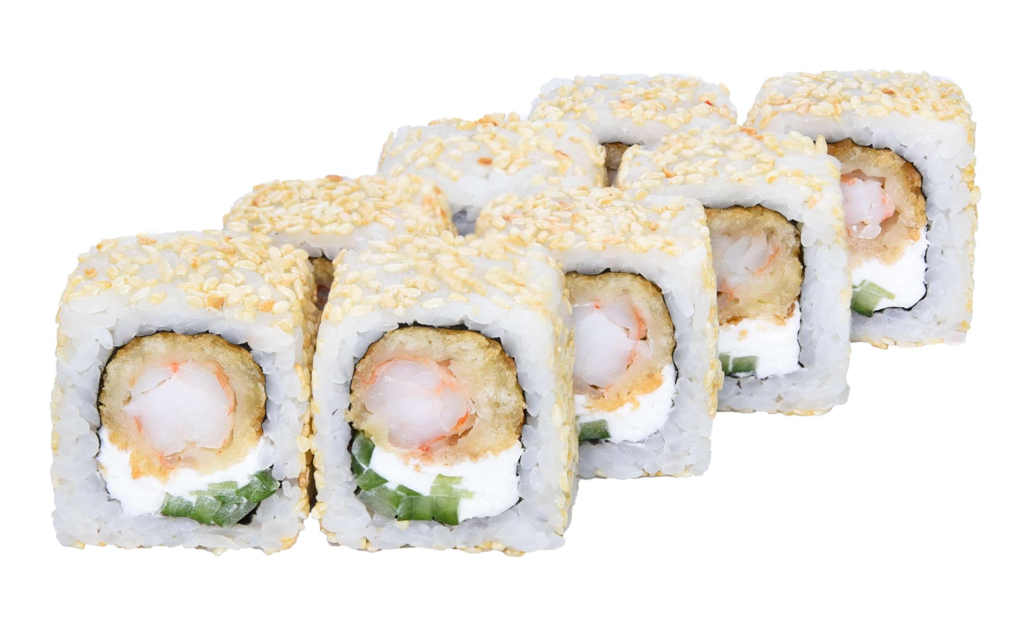 Состав: рис, нори, креветка в кляре, слив. сыр, огурец, кунжут белый.