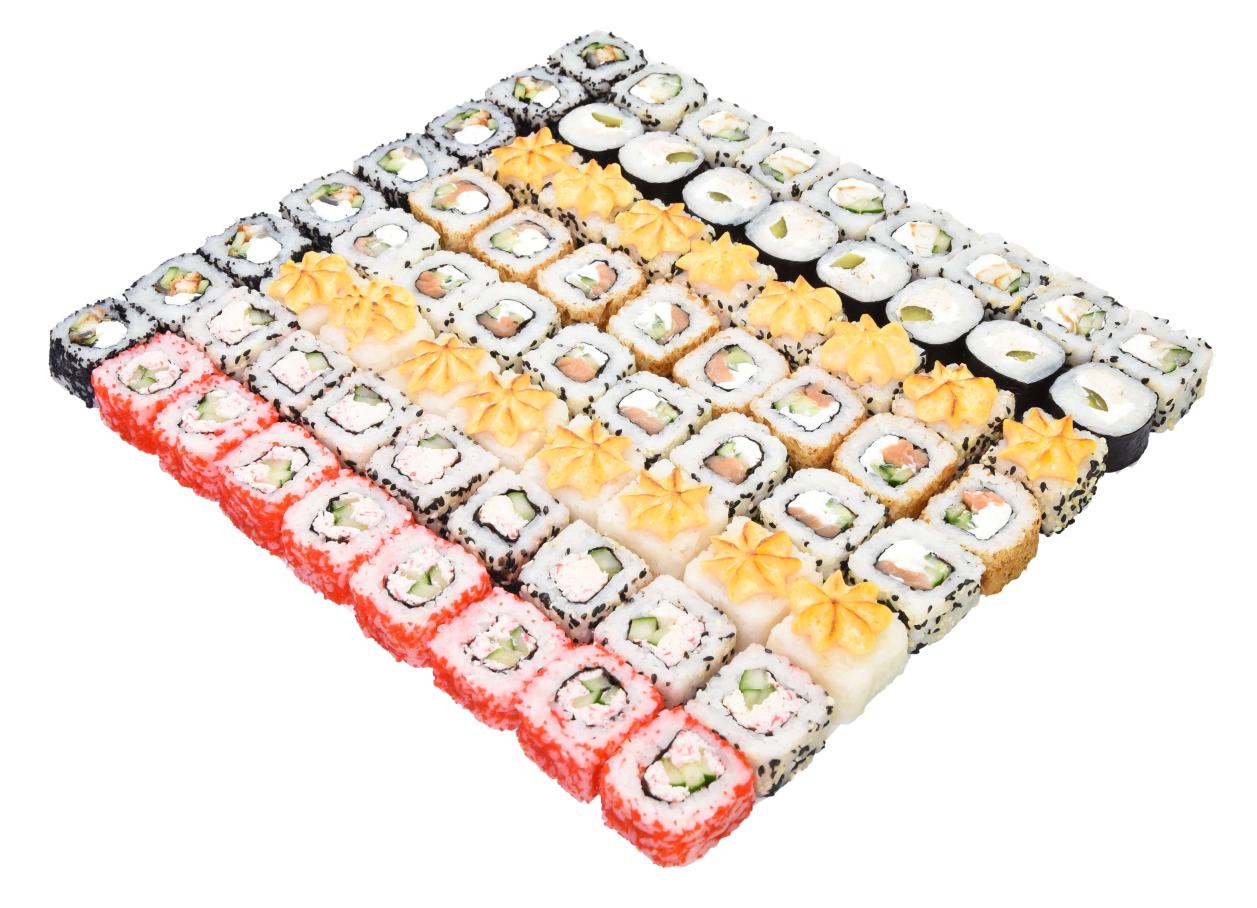 В состав сета входят роллы с: лососем, угрем, окунем, копченой курицей (халяль), икрой масаго, крем крабом, сливочным сыром.