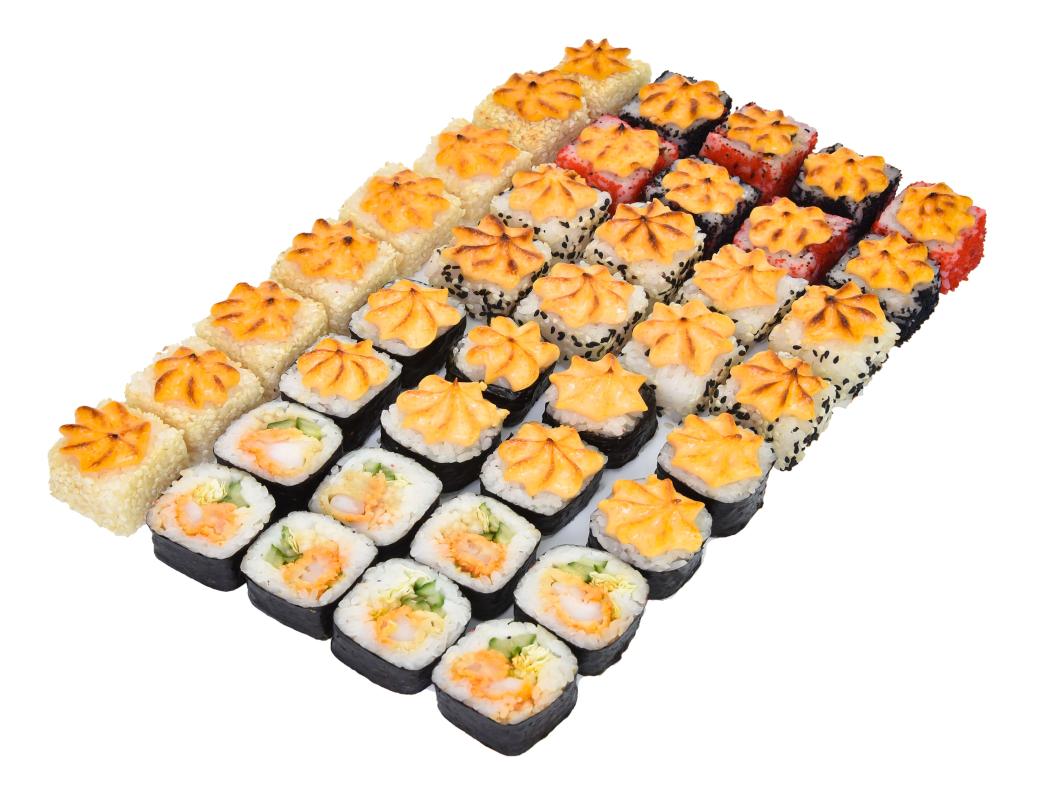 В состав сета входят роллы с: лососем, окунем, копченой курицей (халяль), креветкой, крем крабом, икрой масаго.