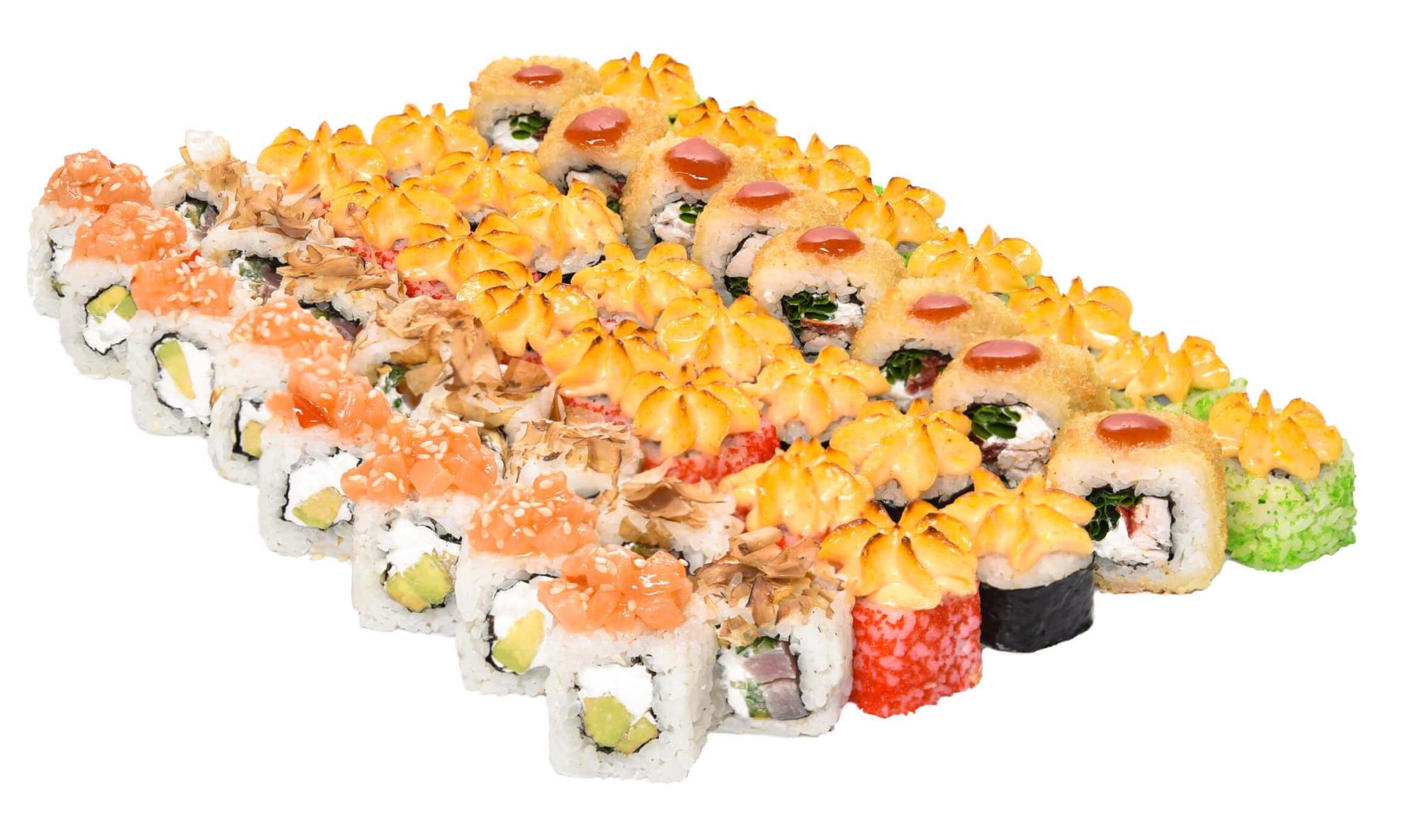 В состав сета входят роллы с: лососем, тунцом, креветкой, копченой курицей (халяль), крем крабом, икрой масаго.
