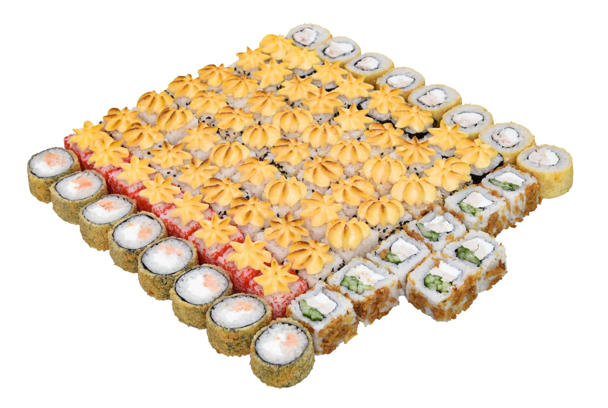 В состав сета входят роллы с: лососем, окунем, копченой курицей (халяль), крем крабом, икрой масаго.