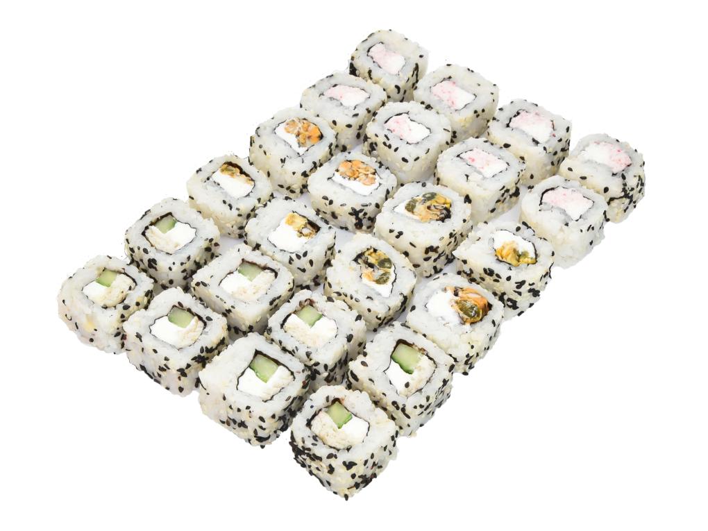 В состав сета входят роллы с: окунем, мидиями, крем крабом.