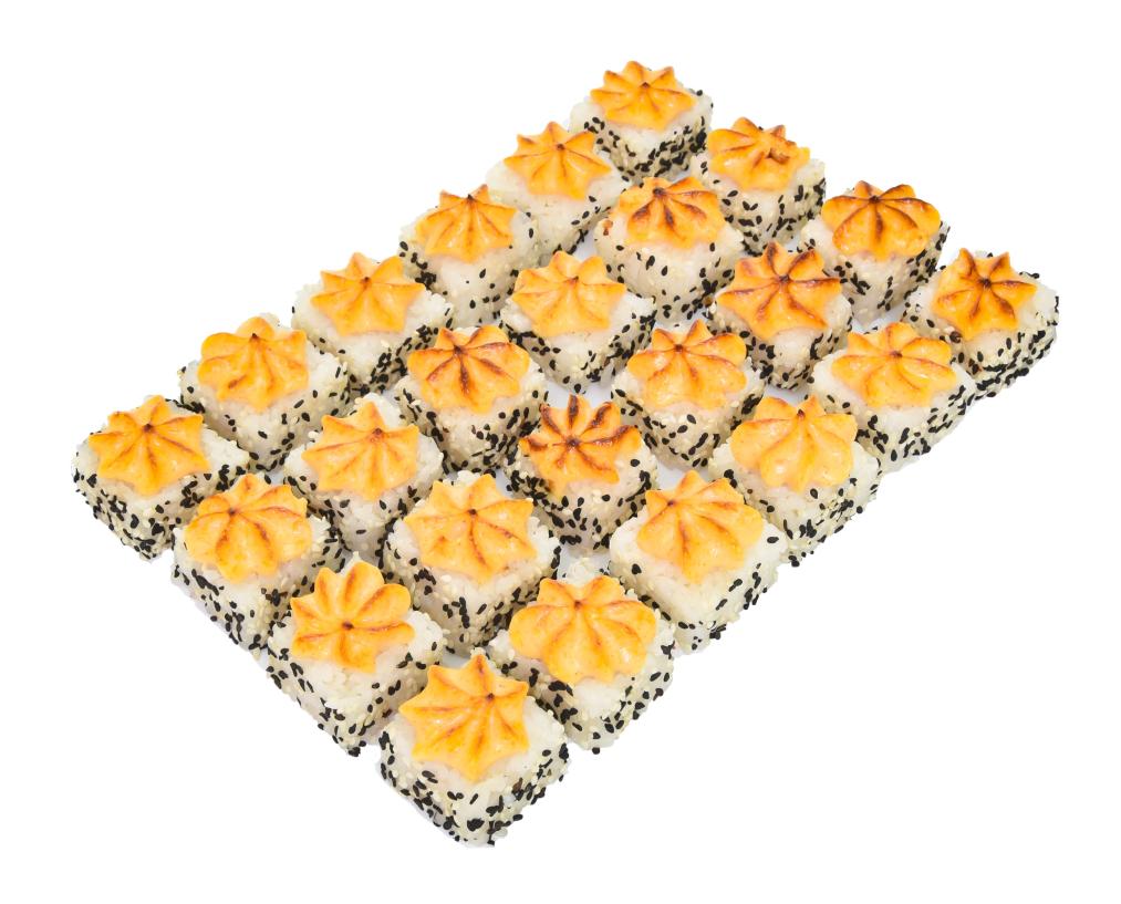 -Фьюжн запеченнный (рис, нори, слив. сыр, мидии, кунжут черный, кунжут белый, яки соус)