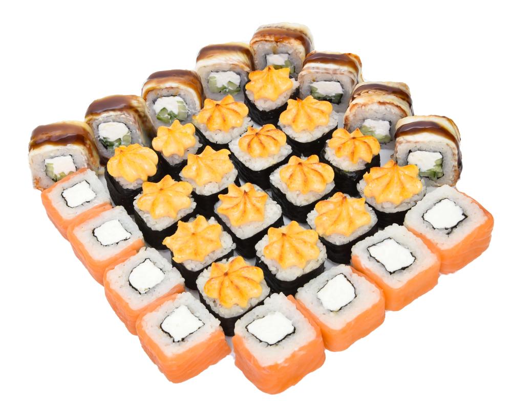 В состав сета входят роллы с: лососем, угрем, креветками, копченой курицей (халяль).