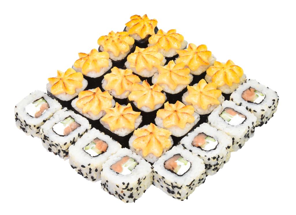 В состав сета входят роллы с: лососем, мидиями, крем крабом.