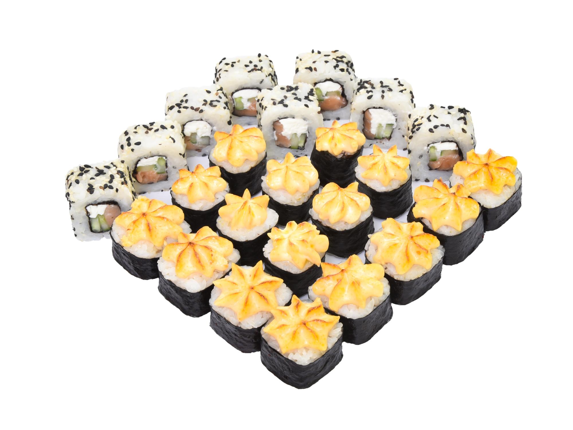 В состав сета входят роллы с: лососем, копченой курицей (халяль), крем крабом.
