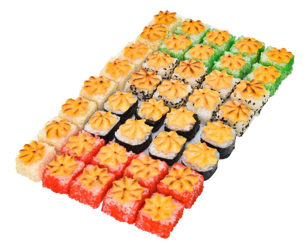 В состав сета входят роллы с: лососем, окунем, мидиями, копченой курицей (халяль), крем крабом, икрой масаго.