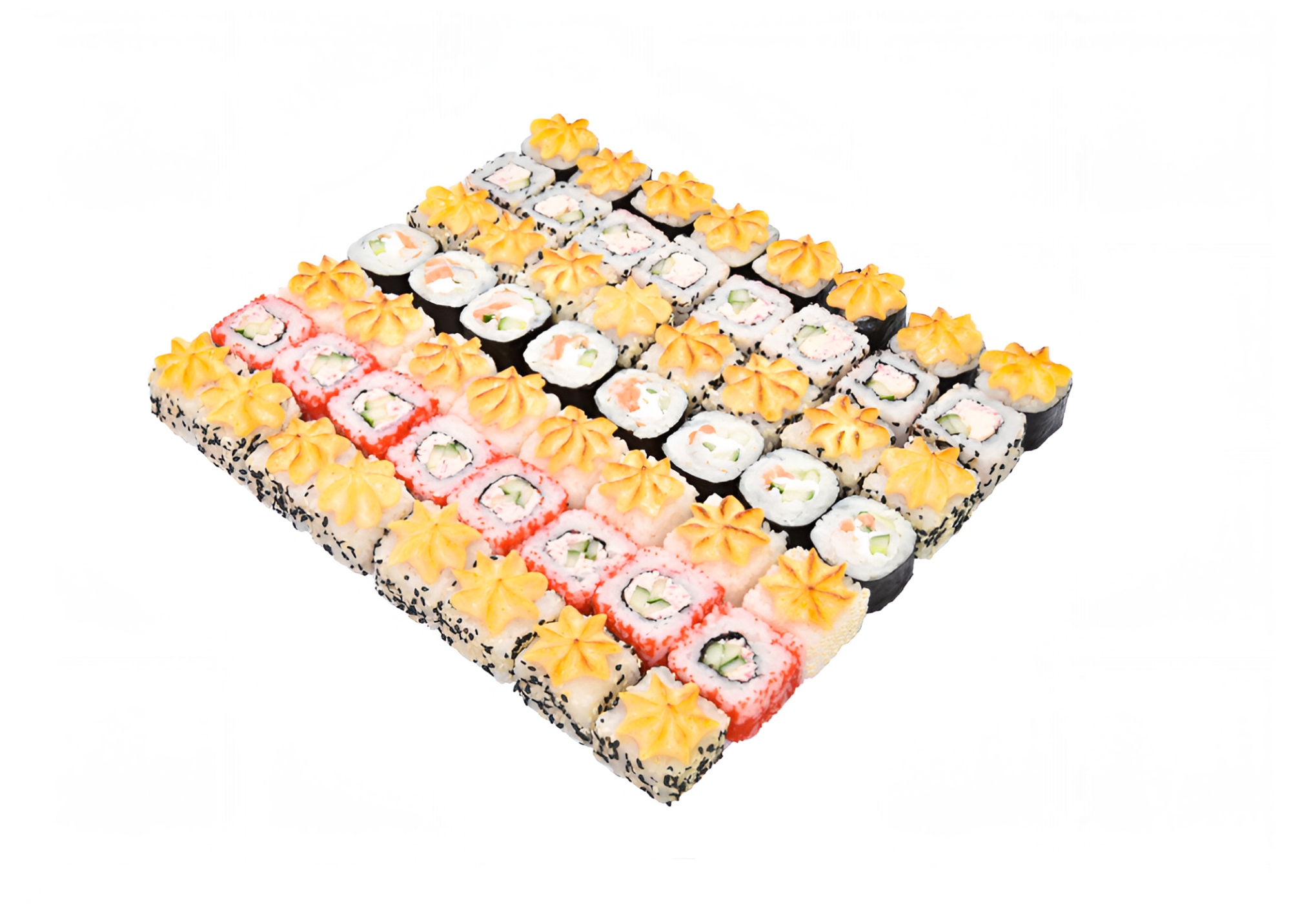 В состав сета входят роллы с: окунем, лососем, креветкой, копченой курицей (халяль), крем крабом, икрой масаго, сливочным сыром.