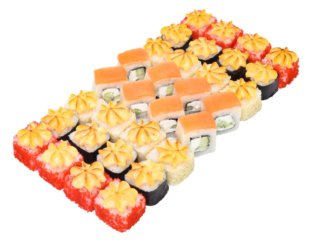 В состав сета входят роллы с: лососем, копченой курицей (халяль), крем крабом, икрой масаго.