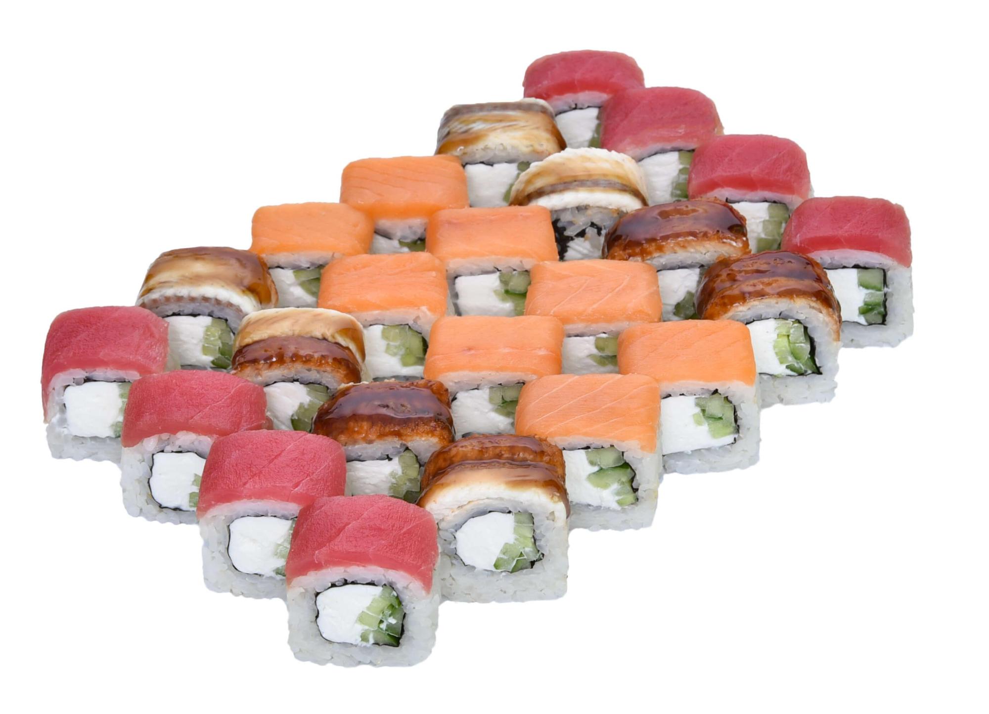 В состав сета входят роллы с: угрем, лососем, тунцом.
