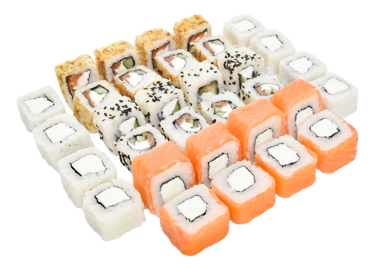 В состав сета входят роллы с: лососем, сливочным сыром.