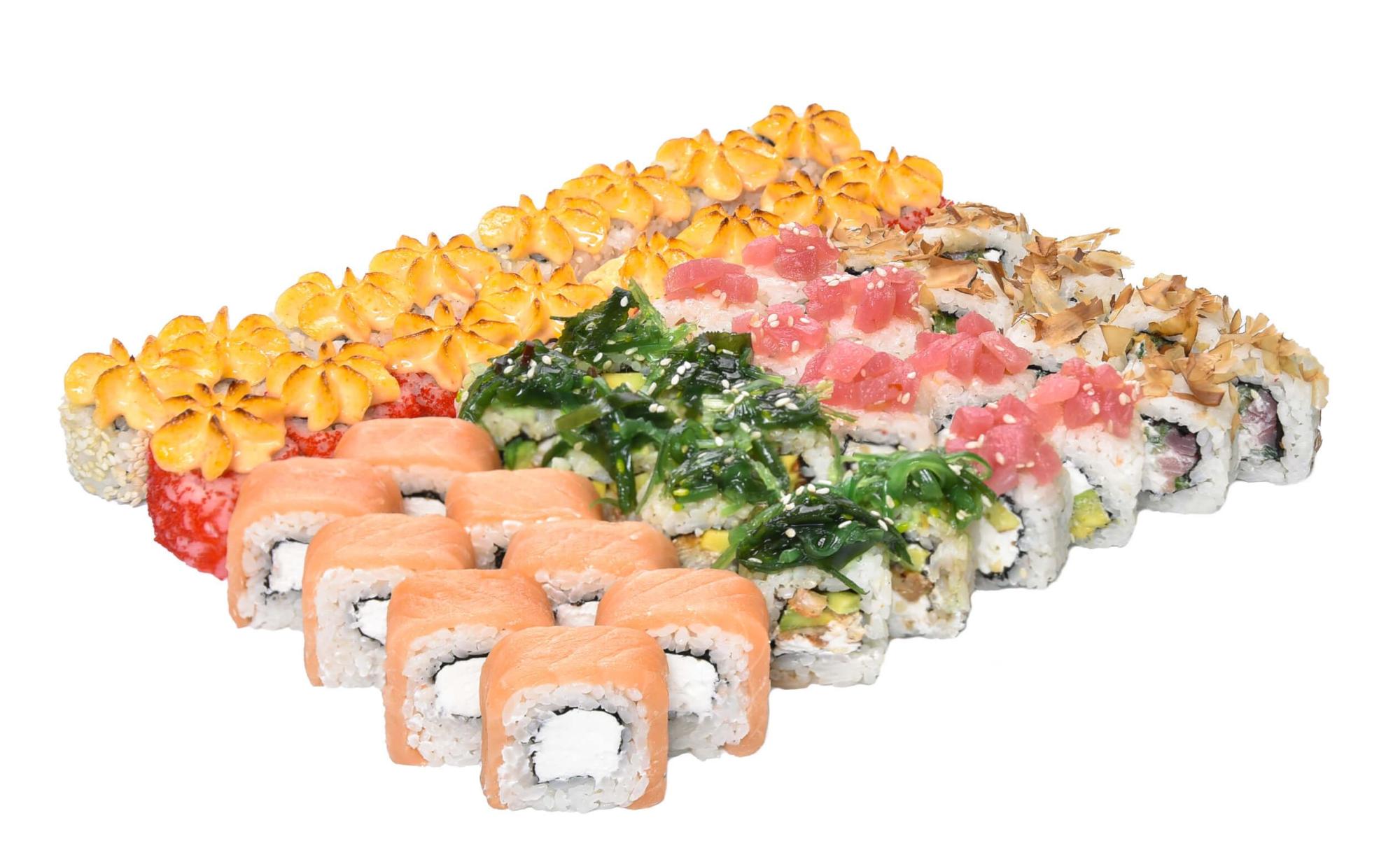 В состав сета входят роллы с: лососем, тунцом, угрем, креветкой, крем крабом, икрой масаго.