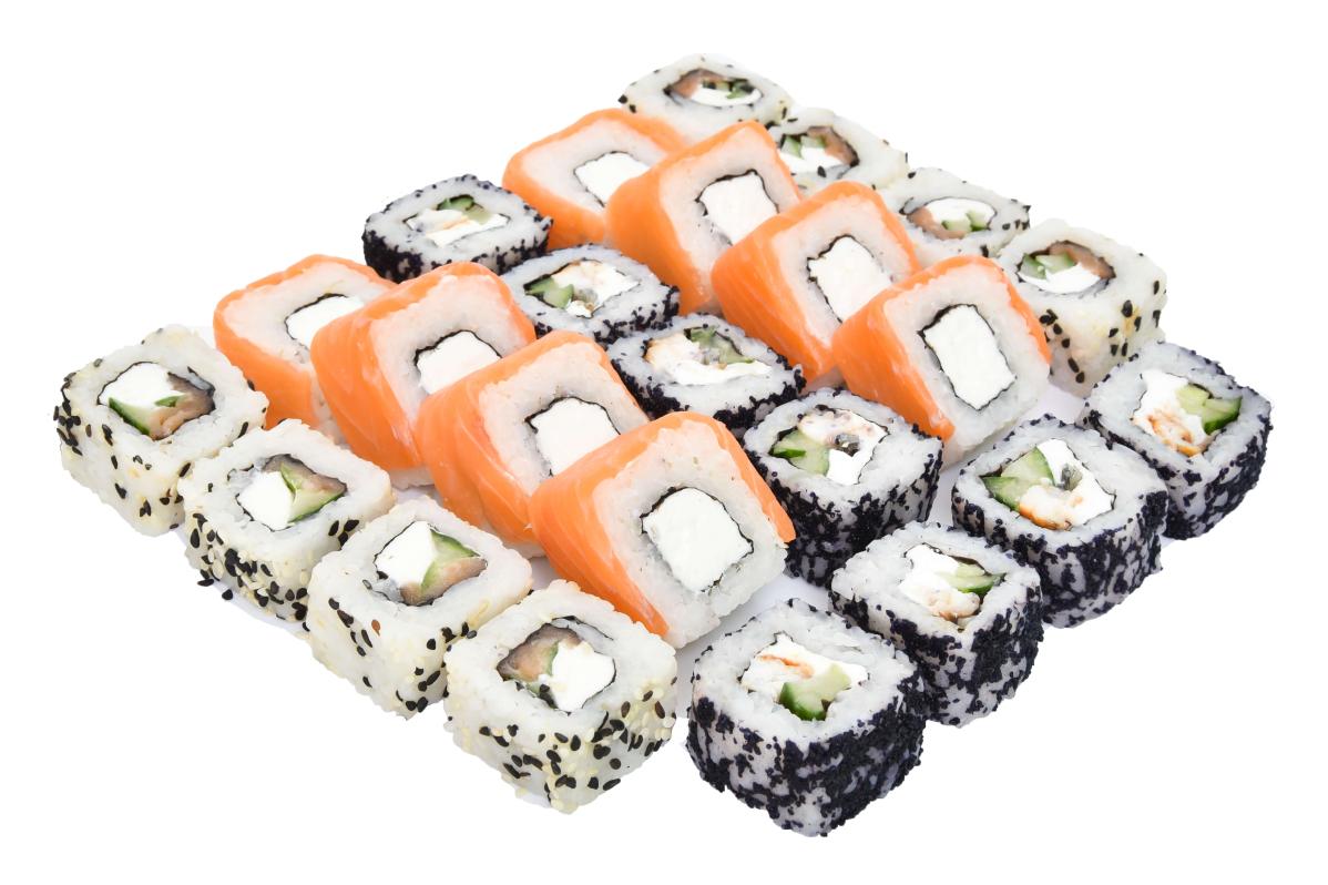 В состав сета входят роллы с: лососем, угрем, икрой масаго.