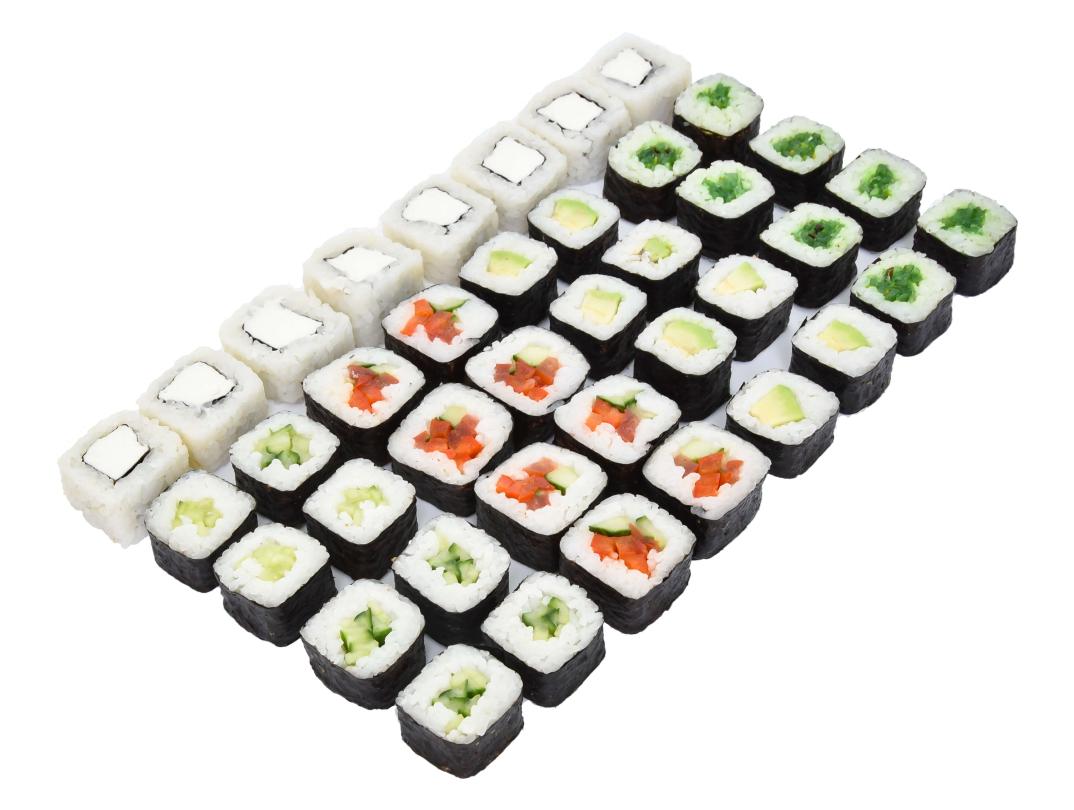 В состав сета входят роллы с: авокадо, болгарским перцем, помидором, огурцом,чукой, сливочным сыром.