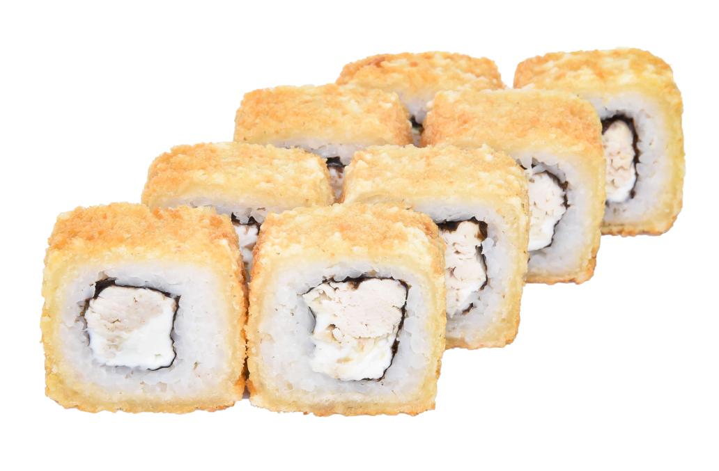 Состав: рис, нори, копч. курица (халяль), сливоч. сыр, кляр, сухари панировочные.
