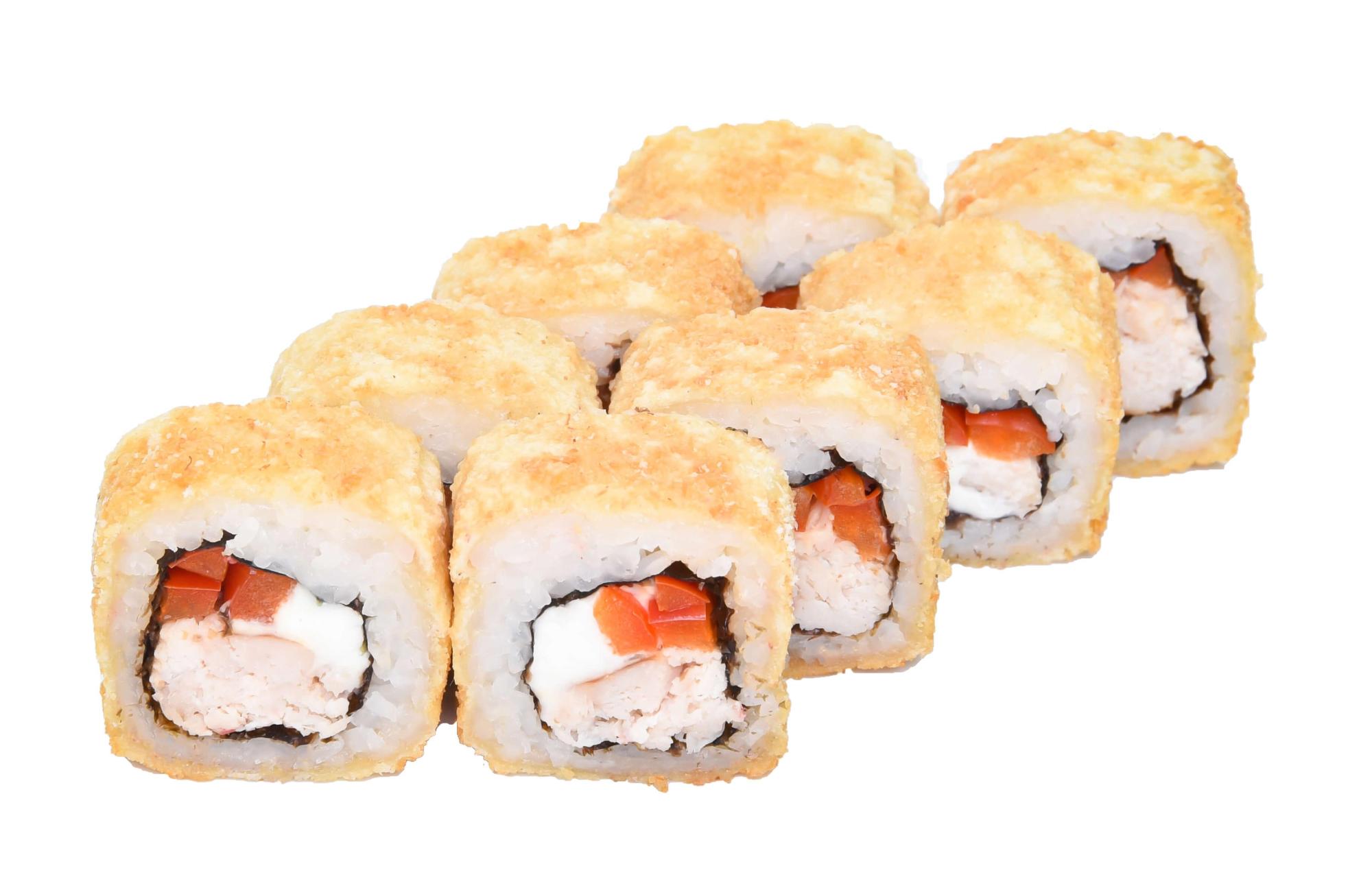 Состав: рис, нори, копченая курица (халяль), болг. перец, салат, слив. сыр, кляр, сухари.