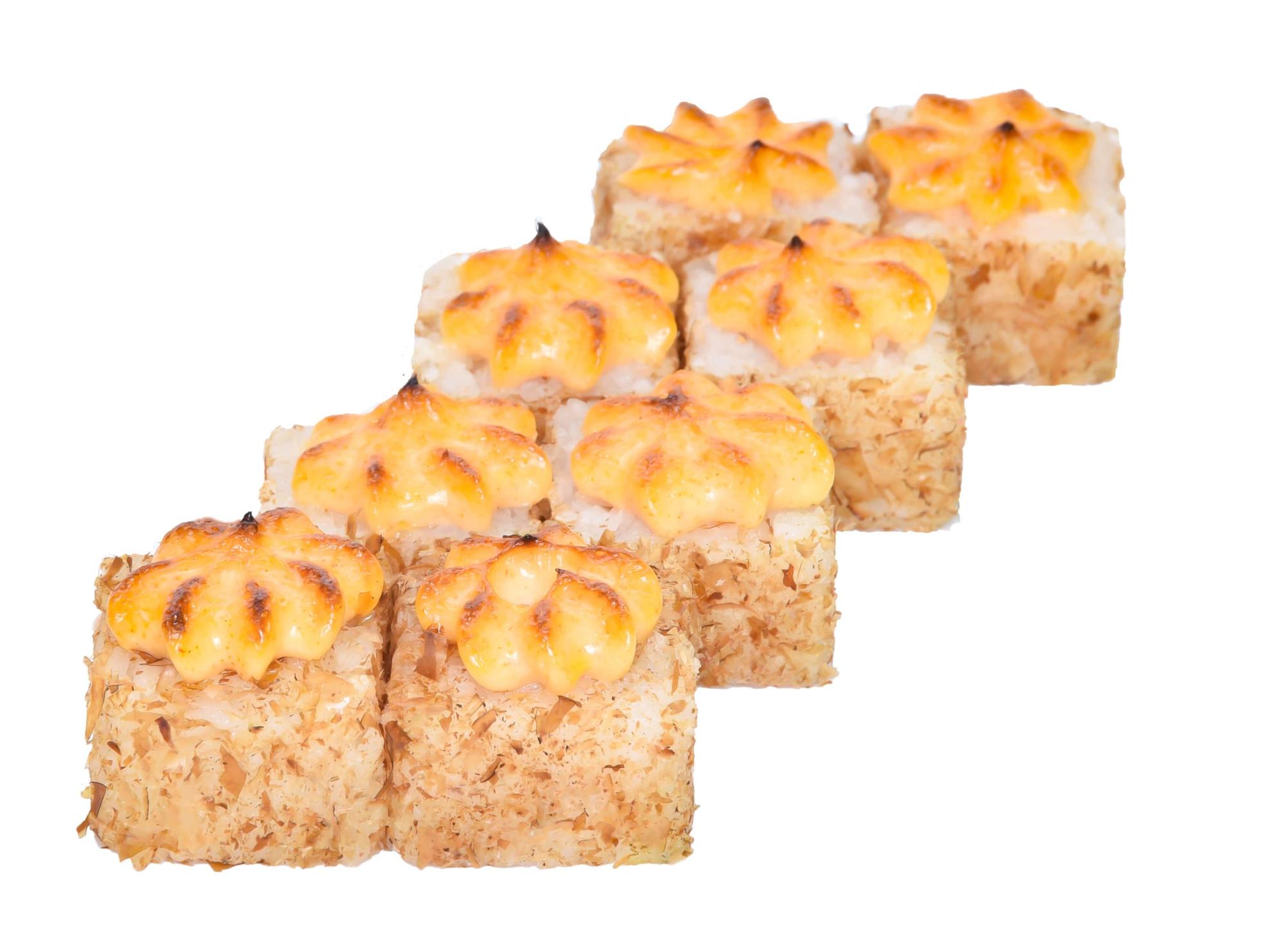 Состав: рис, нори, копч. курица (халяль), сливочный сыр, огурец, жареный лук в кляре, яки соус.