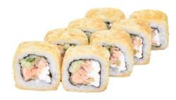 Состав: рис, нори, сливоч. сыр, лосось в кляре и сухарях, огурец, кляр.