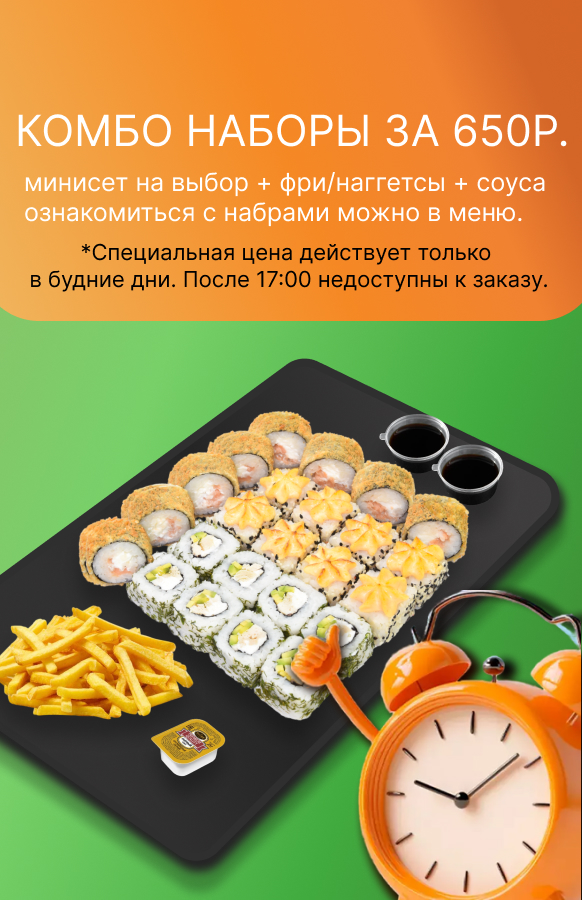 Акция счастливые часы в будние дни с 11 до 17 часов действуют комбо наборы. В комбо наборы входят: минисет на выбор + картофель фри/наггетсы + соуса (1 сырный, 2 соевых). Приборы на 2 персоны прилагаются к комбо набору.